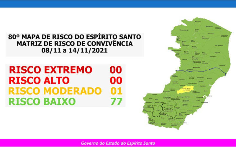 O Governo do Estado anunciou, nesta sexta-feira (05), o 80º Mapa de Risco Covid-19, que terá vigência desta segunda-feira (08) até o próximo domingo (14). Dos 78 municípios capixabas, 77 estão classificados em Risco Baixo e somente um (Santa Maria de Jetibá) em Risco Moderado. Nenhuma microrregião conseguiu atingir os três índices para a classificação de Risco Muito Baixo.